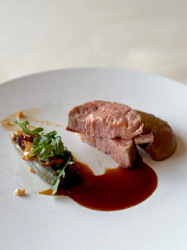 採用法國𝐋𝐢𝐦𝐨𝐮𝐬𝐢𝐧𝐞的小牛肉顏色呈淡粉紅,肉味不算很濃(淡😂)配菜則是茄子以及蒜味極為濃郁的蒜片,整體麻麻地,沒有很驚喜。