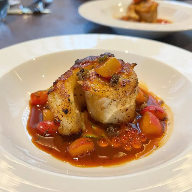 香煎慢煮龍脷魚是法國著名料理🐟把魚肉煎得外脆內嫩,配上帶子裙邊及刁草製作而成的醬汁,龍脷魚捲著帶子,還有三文魚籽帶出兩者的鮮甜,伴上法國小洋蔥,令人津津樂道😍