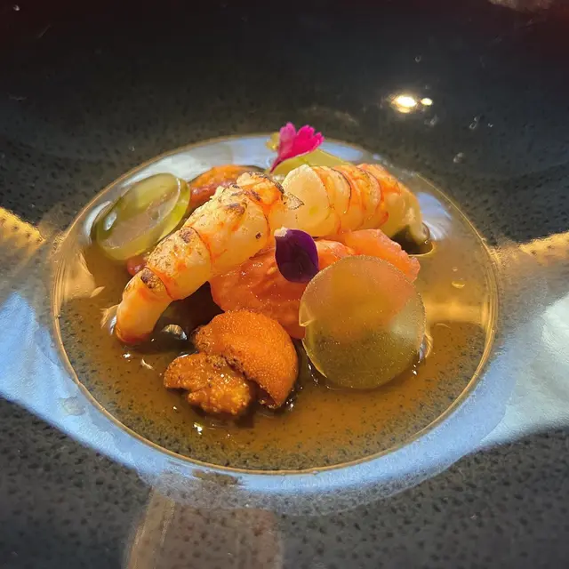 半熟炙燒牡丹蝦和北海道海膽🧡 配上日本溫室蕃茄肉和淋上蕃茄鮮湯🍅 牡丹蝦肉質鮮質味道鮮甜😊