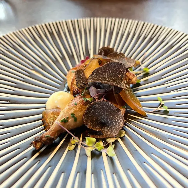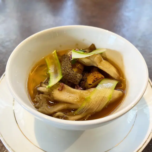 香煎法式鵪鶉,配上椰菜花蓉和醬油漬洋蔥🧅 加上切片黑松露之香氣,乳鴿肉嫩滑味香☺️ 接著有松茸法式清湯(Matsutake Consommé)以高湯和鵪鶉肉汁製作而成的湯品,與主菜味道互相呼應,味道順滑而不膩🥰