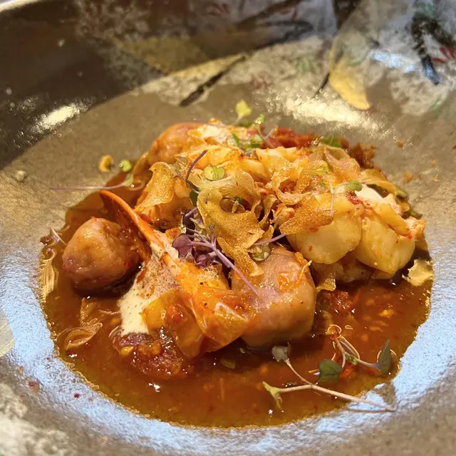 波士頓龍蝦帶香辣蕃茄風味🦞 配菜是美國馬鈴薯和日本紫薯製成的Gnocchi,是一種意大利傳統手作的麵團,類似小芋圓的食物🥔🍠 口感煙韌而味道帶有馬鈴薯香味,加上銀魚打成的泡沫,櫻花蝦和蒜片調味,啖啖龍蝦肉令人回味😍