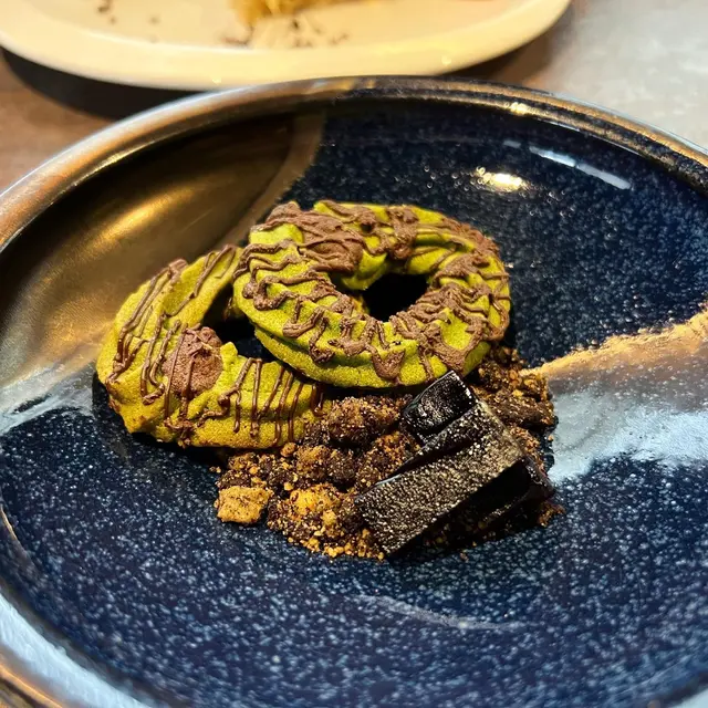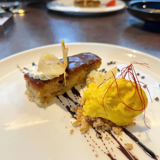 法式蛋糕上是焦糖醬,蛋糕較扎實而不乾,蛋味香濃,加上以糖水浸泡過的腐皮和香梨🍐 配上南瓜慕絲、朱古力醬和餅乾碎,味道不錯🍫🎃 最後還有抹茶曲奇🍪🍵和黑加侖子軟糖作結🥰第四至八道菜 - 第二回待續