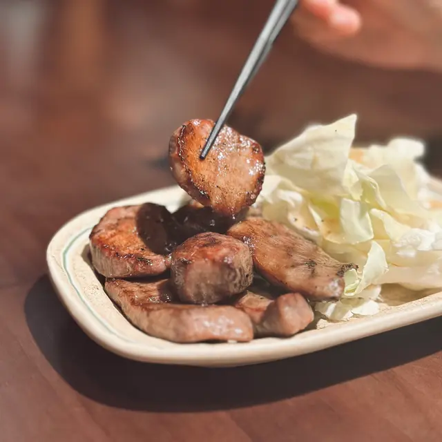 看似樸實的燒物卻見功力。牛腹肉選用筋膜較少的部位,炭火逼出油脂後仍保持柔軟,中心透著淡粉色。簡單撒上竹炭鹽,肉香純粹直接。