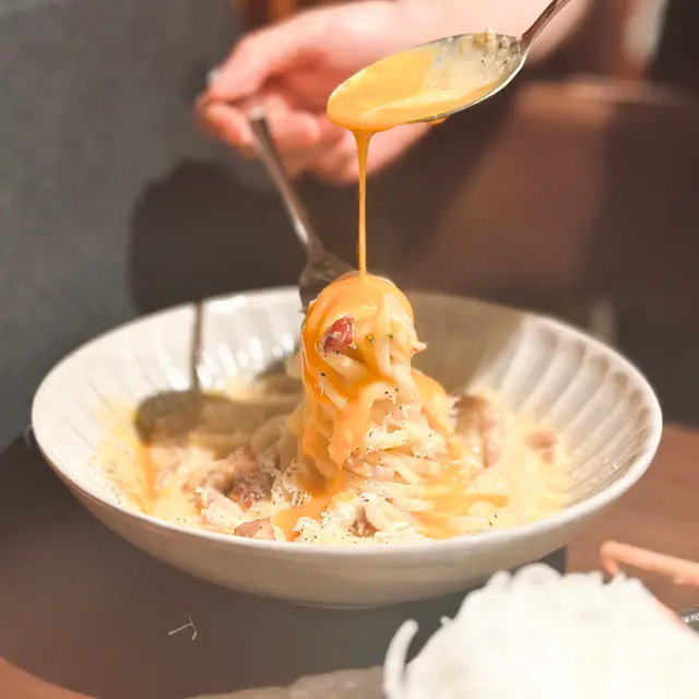 東西合璧的意外之作。以雞白湯代替傳統奶油醬,黏稠度來自蛋黃與帕瑪森芝士,纏繞在彈牙的手打烏冬上。煙燻培根碎增添鹹香,整體風味較日式清湯濃郁,又比歐式醬汁清爽,作為收尾主食頗有新意。