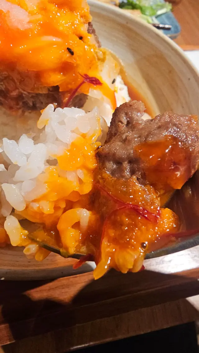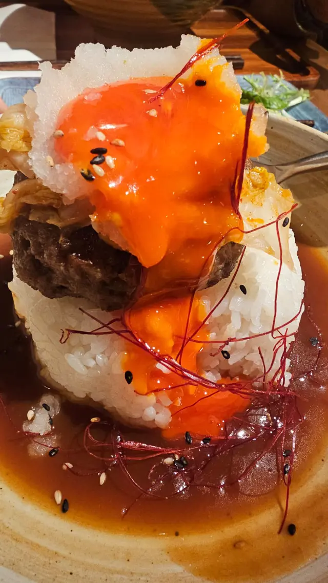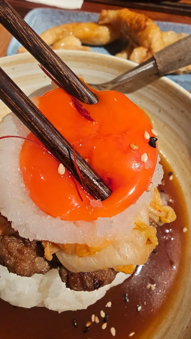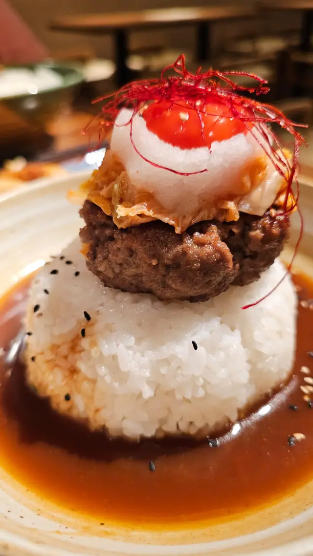 穿著靛藍圍裙的店員輕聲介紹菜單,續茶時總帶著微笑。當料理長端上「熔岩月見漢堡排」,會貼心提醒:「請戳破蛋黃讓肉汁融合哦!」半熟蛋液裹住手打和牛漢堡,搭配燉煮到透光的洋蔥,每一勺都是罪惡的幸福。離座時那句「多謝慢慢」的暖意,比味噌焦糖布丁的餘韻更綿長。在這個喧囂的工貿區裡,用酥脆聲響劃開寧靜,讓職人的專注溫暖脾胃——所謂療癒,不過是咬下雞皮餃子那刻的脆響,與陶杯裡煎茶升起的輕煙。