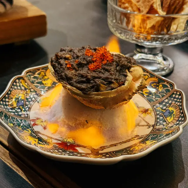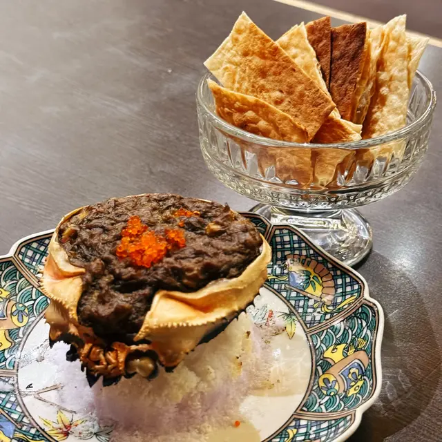 蟹蓋裝滿蟹膏同蟹肉,店員即場火槍炙燒,配嗆鱈魚餅,特別鮮味!