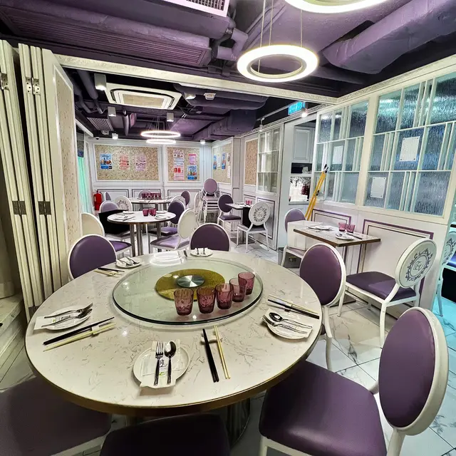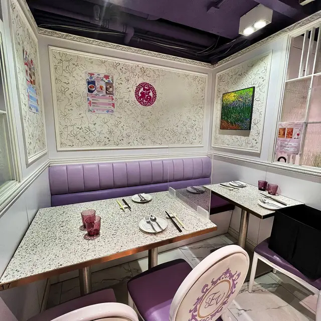 進入餐廳,你會立刻被它的少女與高貴感的氛圍所吸引,淺紫色的椅子與白色的桌子結合在一起,簡潔大方的裝潢,營造出一種柔和而不失活力的氛圍,讓人感到舒適和放鬆。