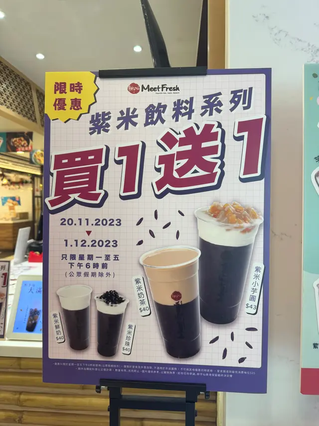 由2023年11月20日至12月1日,顧客於指定分店購買紫米系列飲品,即可享有買一送一優惠,包括紫米鮮奶、紫米珍珠、紫米奶茶及紫米小芋圓