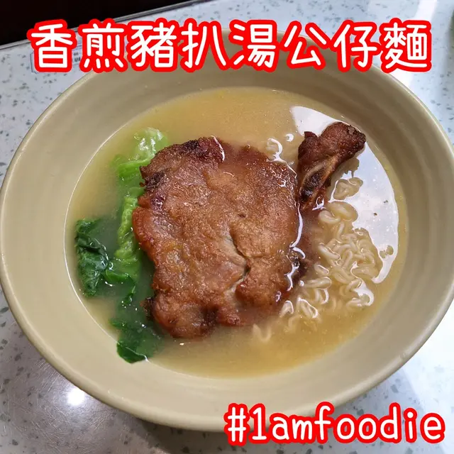 我就想簡簡單單食啲嘢,但裡面裝修懶懷舊咁其實都算有誠意。而我揀咗個窗口位係可以睇晒來往新蒲崗嘅行人,方便搵出道歉哥。坐低叫咗個 $43 嘅特餐,主食一款,係「香煎豬扒湯公仔麵」,味道正常,發揮到正常水準。