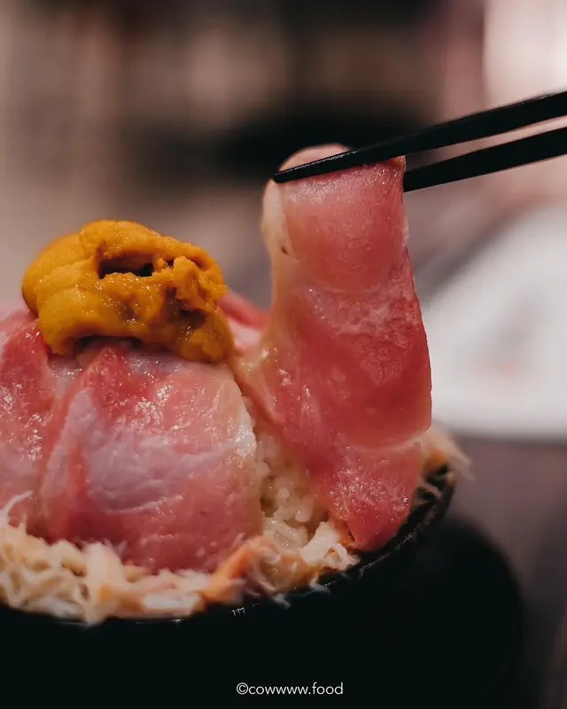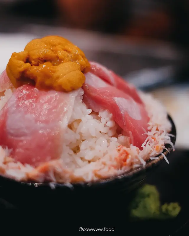 呢碗飯面頭鋪咗大約8塊拖羅,拖羅肥美甘香,油脂豐富。而飯邊圍滿鮮甜蟹肉碎,最畫龍點睛嘅係放喺拖羅上面果份海膽,海膽用咗加拿大海膽,算係海膽中最肥厚,而且同日本海膽一樣滑不溜口🤤✨