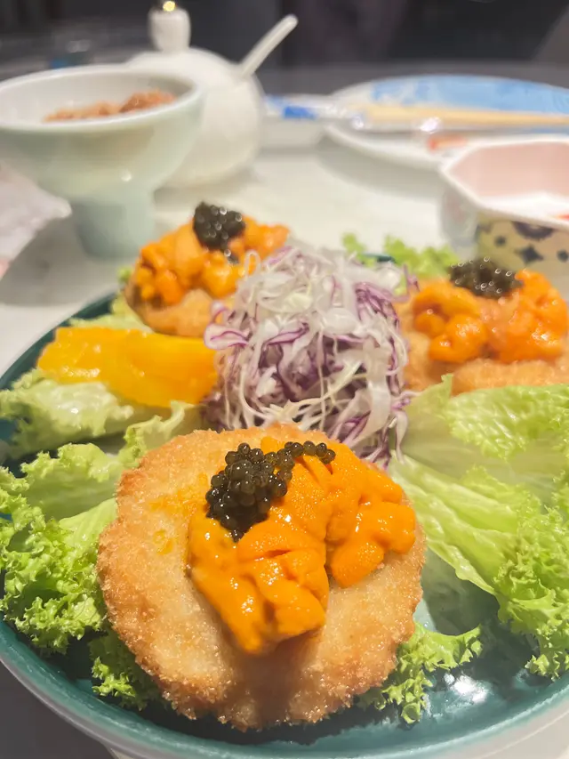 墨魚餅彈牙好食,在上面加海膽,色香味俱全。