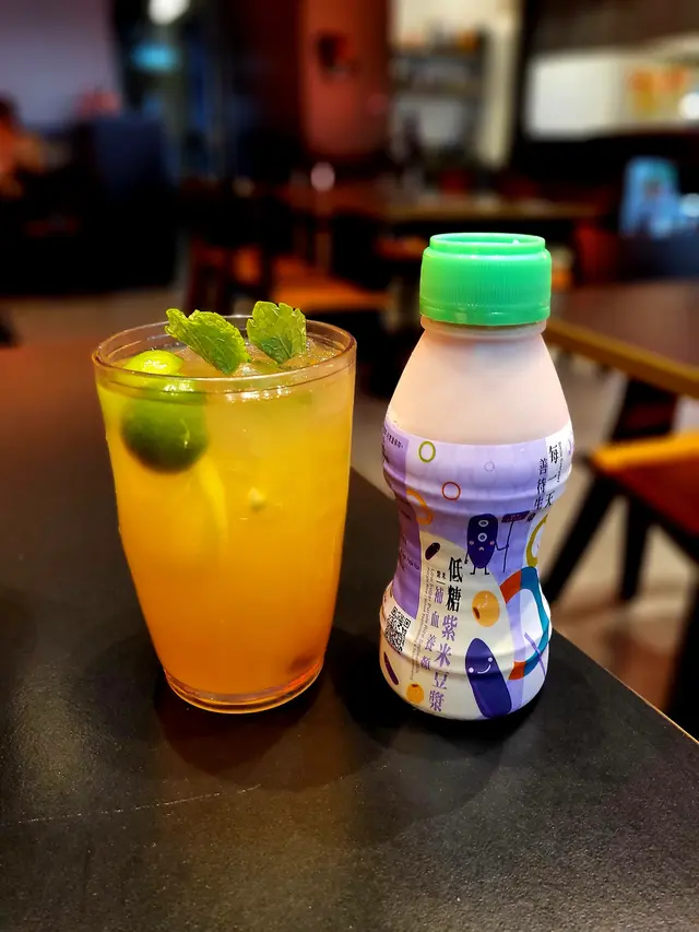 檸檬冰桔茶冰冰涼涼,酸甜解膩;紫米豆漿豆味重,口感順滑,可解熱氣。