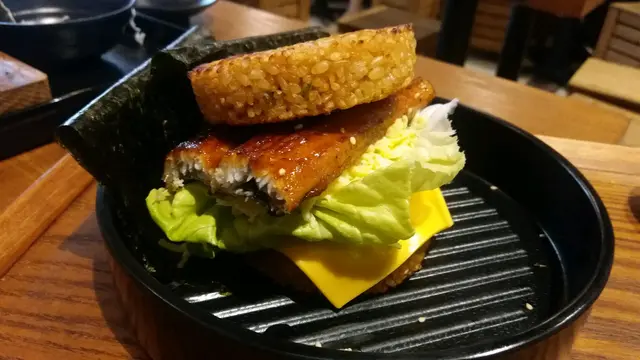 賣相很有趣,圓型的米漢堡內,放了半條鰻魚,還有生菜及芝士,吃時包著紫菜享用,漢堡的層次感豐富,米漢堡香脆中帶點煙韌,鰻魚魚肉嫩滑,非常香口,配上香甜燒汁,以及爽口生菜,很好吃,美中不足是因熱度不足,芝士不能半融化,這裏就要扣點分了。