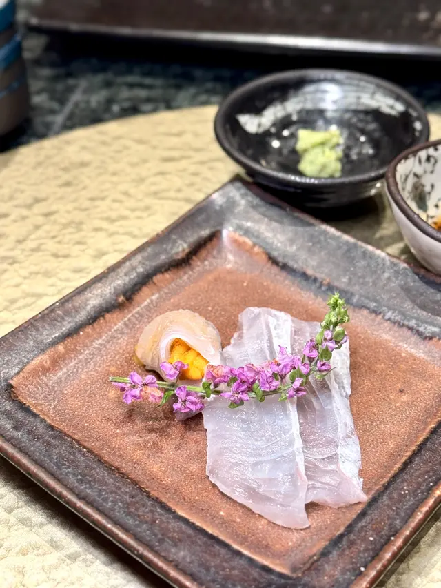 【🐟刺身部分】 1️⃣ 左口魚捲海膽 左口魚薄到透光嘅魚身包住澎湃嘅海膽,咬落去先感受到左口魚嘅爽彈💫海膽即時爆發濃郁奶香,鮮甜得嚟帶微微海水味,兩者交融簡直係天堂級享受!
