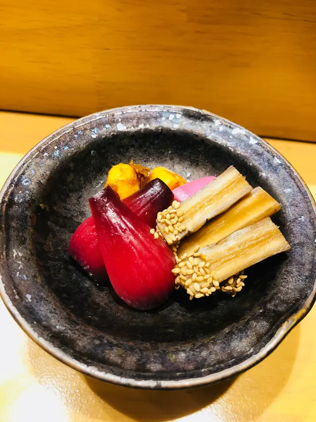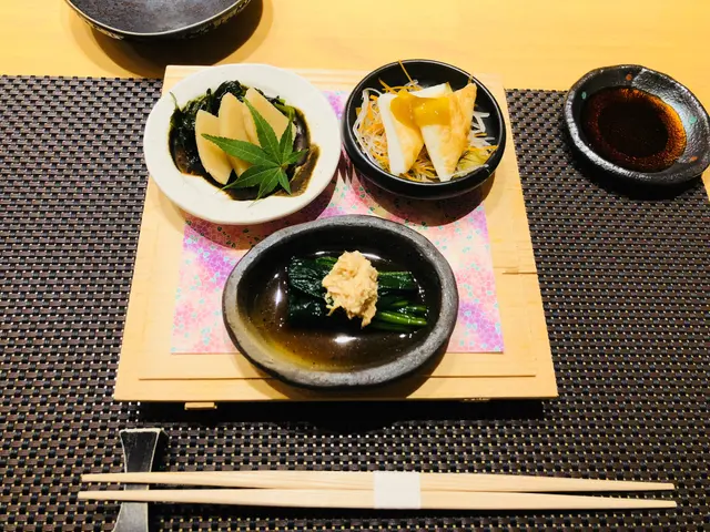 前菜有三小碟,菠菜三文魚清甜,配上綿蓉的三文魚,十分開胃;魚餅煙韌彈牙,淋上微辣的芥末醬,更是惹味;若帶竹筍清爽多汁,甘甜脆感像馬蹄,每款都很醒胃。