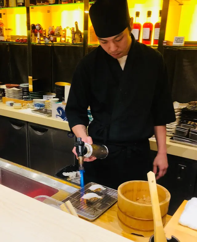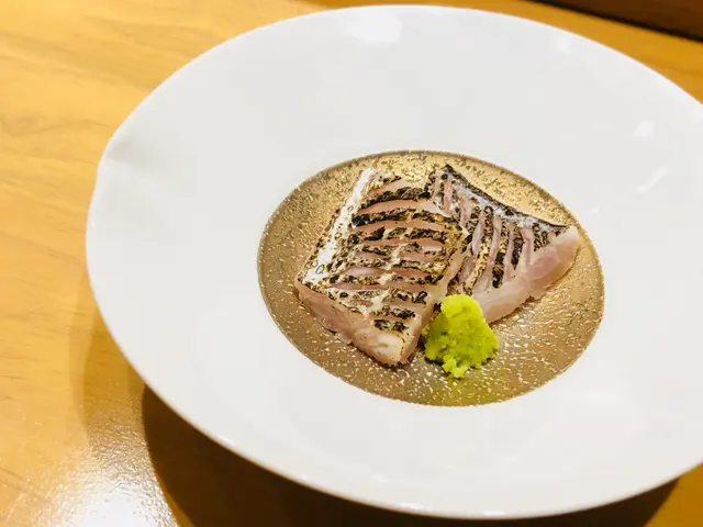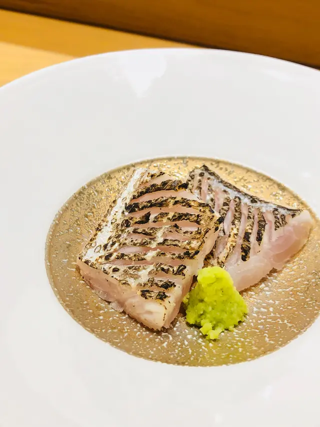 第四道刺身: 火炙太刀魚,用刀切成割痕,用火槍燒至焦香,魚皮帶燶而香口,魚油被迫出,魚味濃郁而不油膩,灑上岩鹽點綴,甘香惹味。