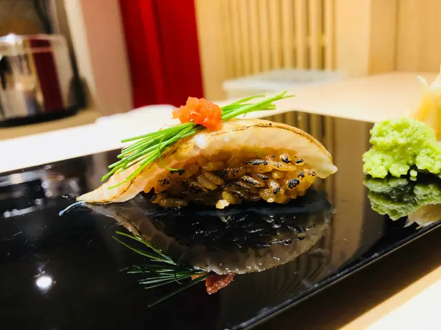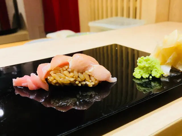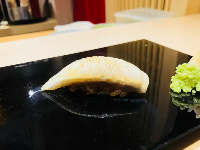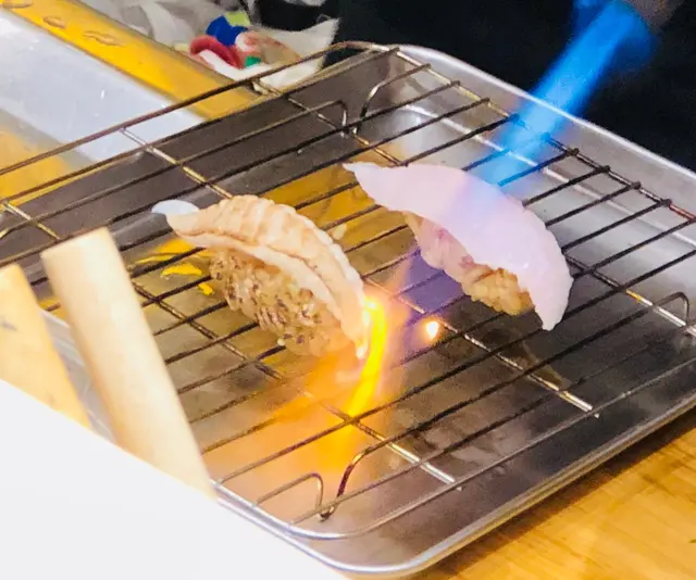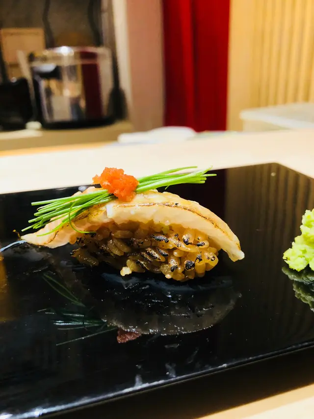 第四道壽司: 右口魚邊壽司,裙邊口感最好吃,因為活動量較高。魚肉被火炙後,入口散發魚油甘香,鮮甜之餘,配上BB蔥及明太子,新鮮而惹味。
