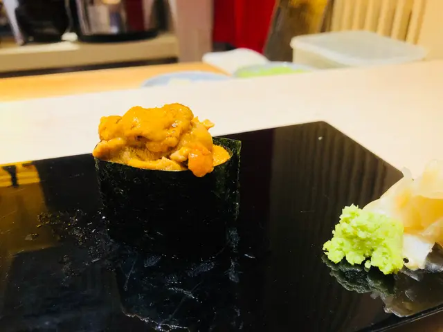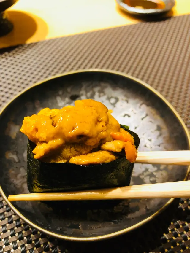 第六道壽司: 海膽壽司,色澤澄黃的海膽疊至高高,紋理清晰,帶淡淡海水味,Creamy口感夾合在脆紫菜中,啖啖窩心!