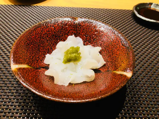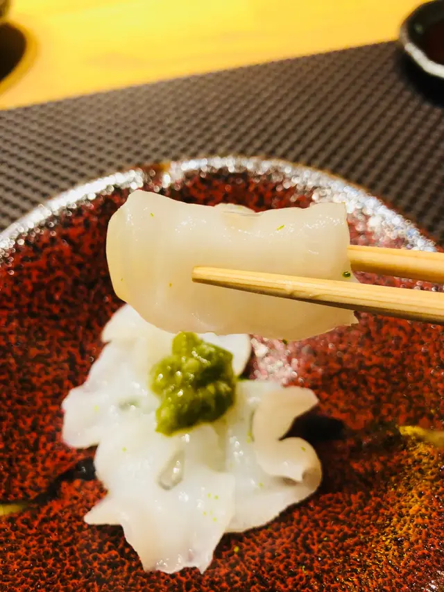第一道刺身: Wasabi漬水八爪魚,切成薄片,質感爽口、帶嚼勁,沾上Wasabi,泛辣並提鮮。底部墊有青檸,中和了辣味,特別清新。