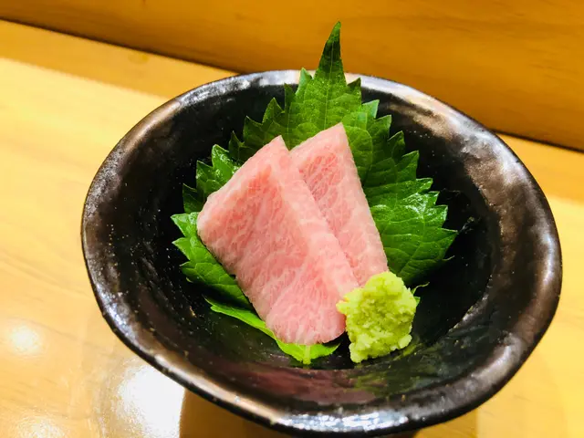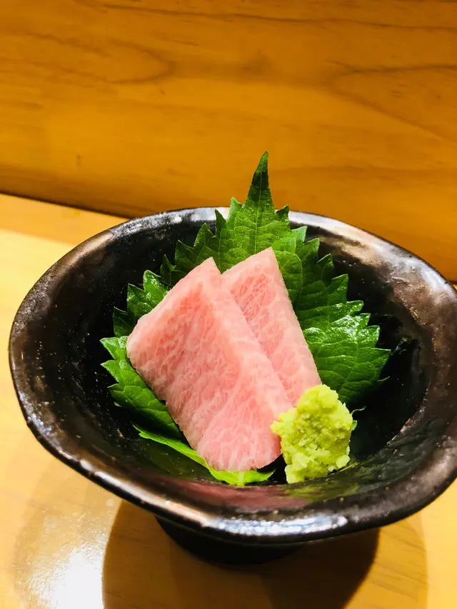第六道刺身:拖羅,刺身厚切,油花均勻滿佈,魚脂豐腴,綿化口感真是很幸福呀!