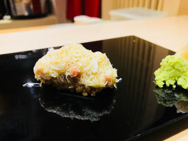 第一道壽司: 毛蟹壽司,蟹肉拆成一絲絲,整齊的放在醋飯上,入口的鮮甜蟹香,絕對適合懶惰的蟹控!
