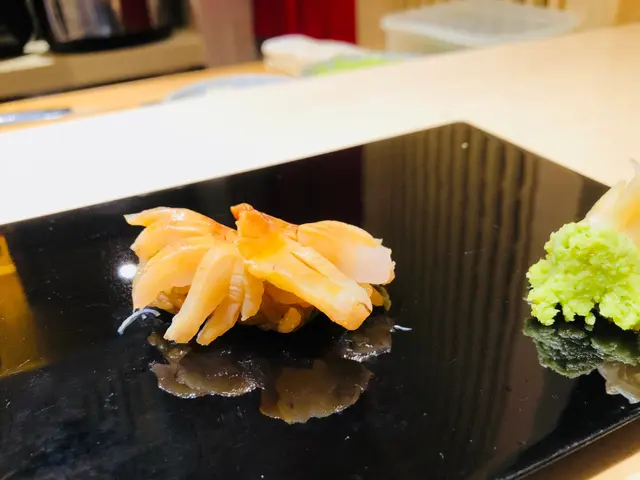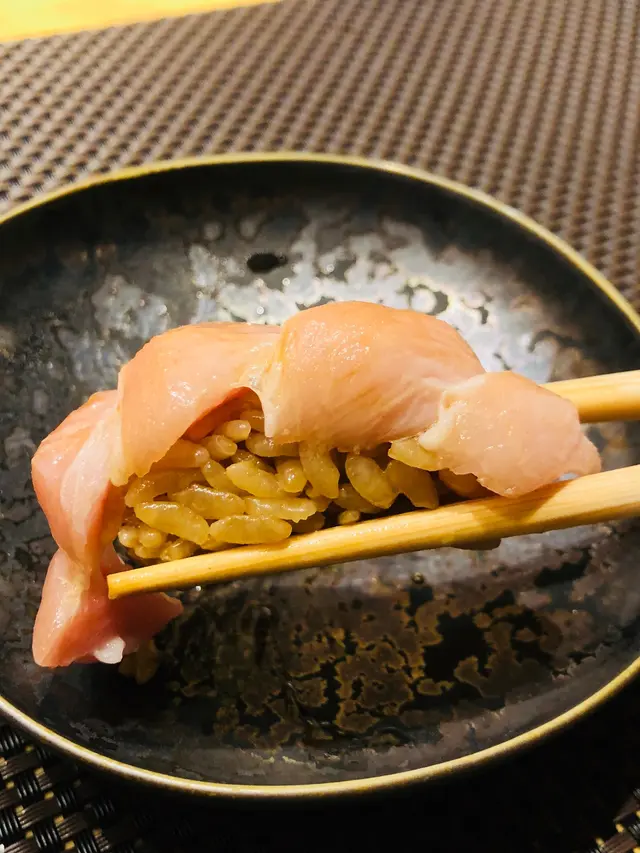 第二道壽司: 赤貝壽司,色澤呈橙紅色,沾上少許醬油送入口,口感十分爽脆,鮮甜味道中沁出淡淡海水味,洋溢獨有的海洋氣息。