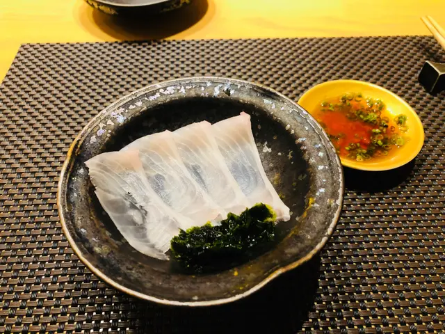第二道刺身: 鮫鰈,薄切至晶瑩剔透,肉質細嫩柔軟,吃下去啖啖清甜,沾上酸醬汁,令人食慾大增!