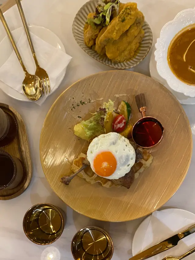 除左原隻油封鴨腿配牛角包窩夫🧇外,仲有隻煎太陽蛋及糖漿。油封鴨腿完全唔油膩,皮下脂肪基本上完全不存在,肉質緊緻得黎唔會乾柴;配上香脆窩夫同流心太陽蛋,有多重口感;糖漿有質素,食落唔會太甜又唔涸喉,似乎係楓糖漿,就算食完個窩夫都情不自禁地食埋餘下嘅糖漿😛。