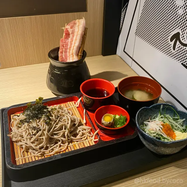 要左冷蕎麥麵 (+$10)、沙律同麵豉湯,豬腩條經過蒜香醃製,燒烤後外皮香脆,內裏多汁。配搭蕎麥麵,一冷一熱,口感層次豐富🫶🏻