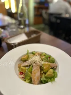【芝士牛油果雞肉沙律】(半份)新鮮牛油果配嫩滑雞肉份量好足,芝士碎灑得大方,係開胃之選