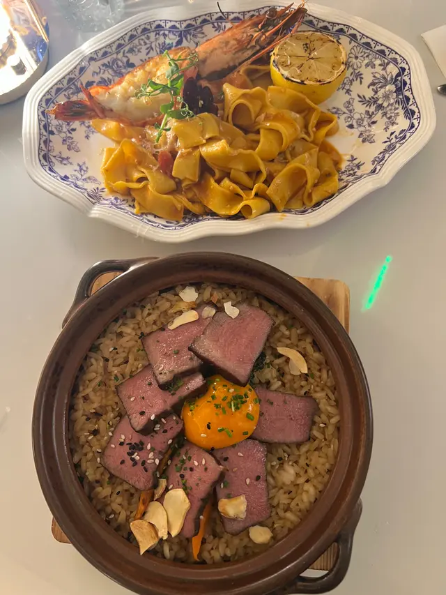 必試「煙燻豬面肉炒椰菜花」($108),鹹香豬面肉同清爽椰菜花形成絕妙平衡;「香煎安格斯牛舌芯燴意大利飯」($178)將日式燒鳥店常見嘅牛舌芯融入意式risotto,軟嫩彈牙;「燒珍寶大蝦蝦汁手工闊面」($178)用蝦頭熬製濃郁醬汁掛滿每條闊面,鮮味爆發!