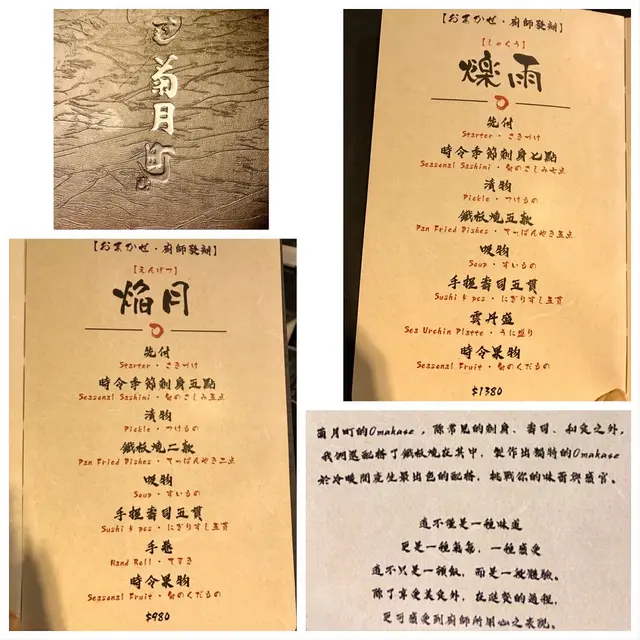 打開menu, omakase分別有<爍雨>同<焰月>兩種,媽呀!!2個set都好吸引呀~ 🙈ok,最後揀咗$980的<焰月>~