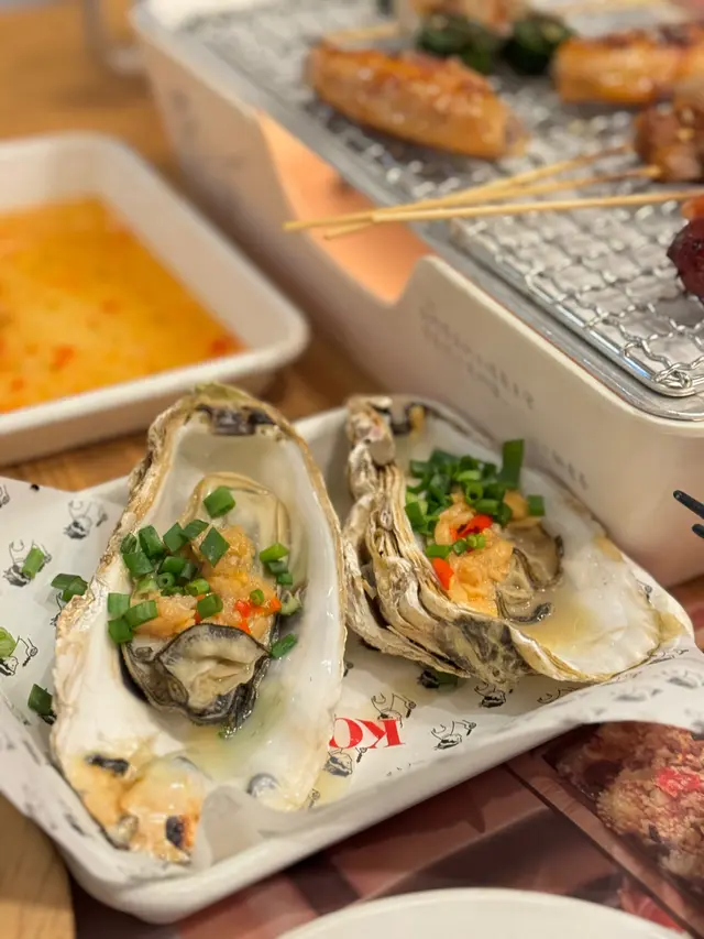 🦪蒜蓉烤生蠔($36) 肉質肥美,兩款海鮮都蒜味香濃;🦑Q彈小墨魚($36/2串) 爽口彈牙😋