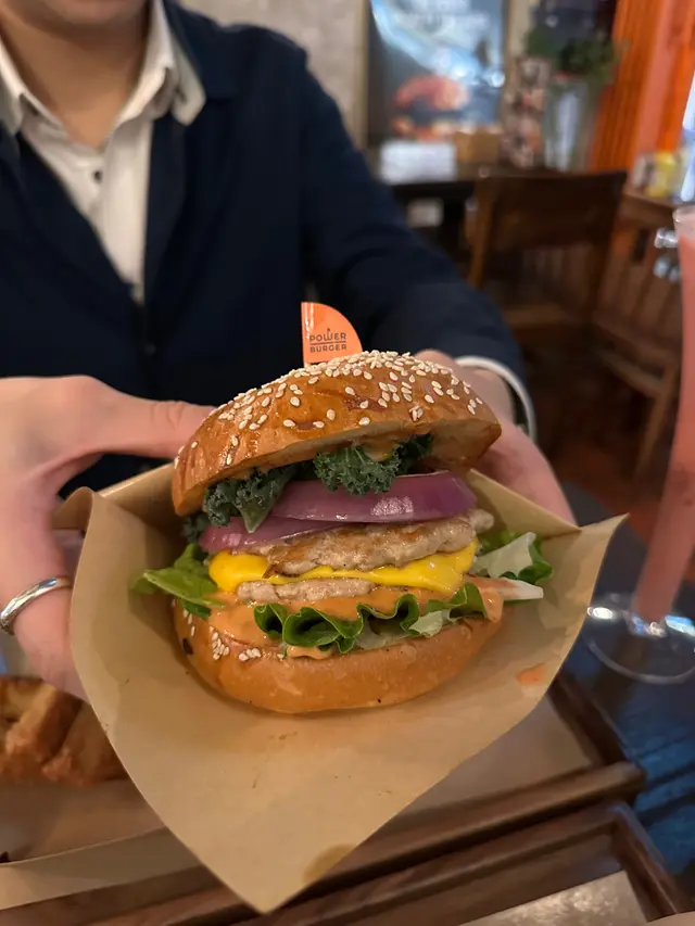 焦脆雞堡有兩片天然雞肉餅,同樣配上奶酪、洋蔥、有機蔬菜和自製醬料,口感鮮嫩多汁。好驚喜唔係炸雞,個雞做得好好!必須要講個自製醬料係好有特色又好出色,令成個包昇華咗!無誇張。朋友話可以之後成日過嚟再食!