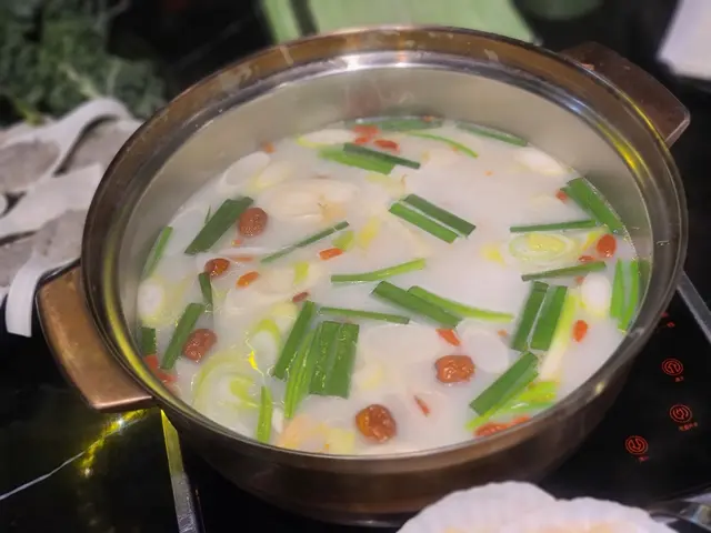 火鍋湯底方面,閨密說要養顏補身,可以選擇了這個湯底。湯底呈現奶白色,用料有人參鬚、紅棗、杞子、豬肉、雞件、薑、薏米、京蔥,食材豐富新鮮,入口香甜鮮美,清淡健康,人參味道恰好,而且有補氣生血等各種滋補功效。