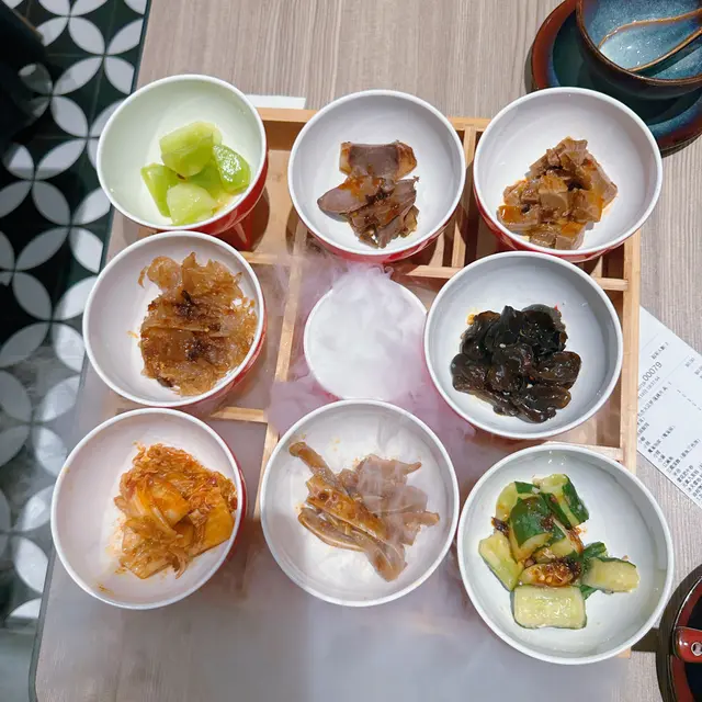 打卡之選📸️九宮格入面有哂呢度招牌既配菜,每款各有特色,包括蒜泥拍黃瓜、雲耳、麻辣豬耳、香醋海蜤頭、萵荀、鹵雞腎、跳水一口牛舌同香辣山木耳,而且中間仲有乾冰,有種煙霧離漫既效果🤩