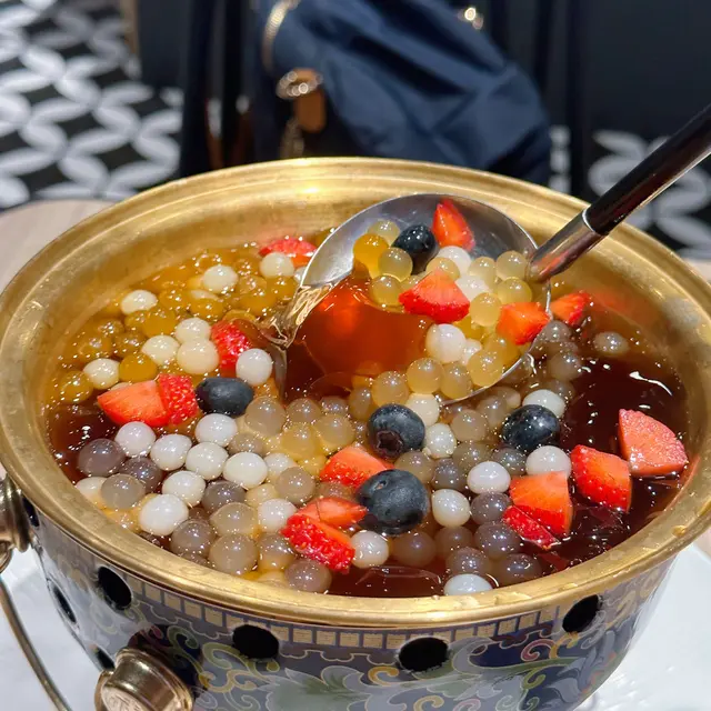 超吸睛🤩大碗入面原來係桂花冰粉,上面仲有荔枝乳酸爆珠同士多啤梨藍莓粒粒,食落清涼又透心涼😝而且口感仲好豐富。另一款係金滿地糍粑,由糯米製成既糍粑,外層舖滿黃豆粉,再沾上黑糖,食落甜而不膩😚