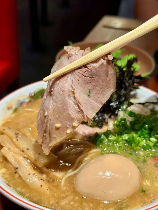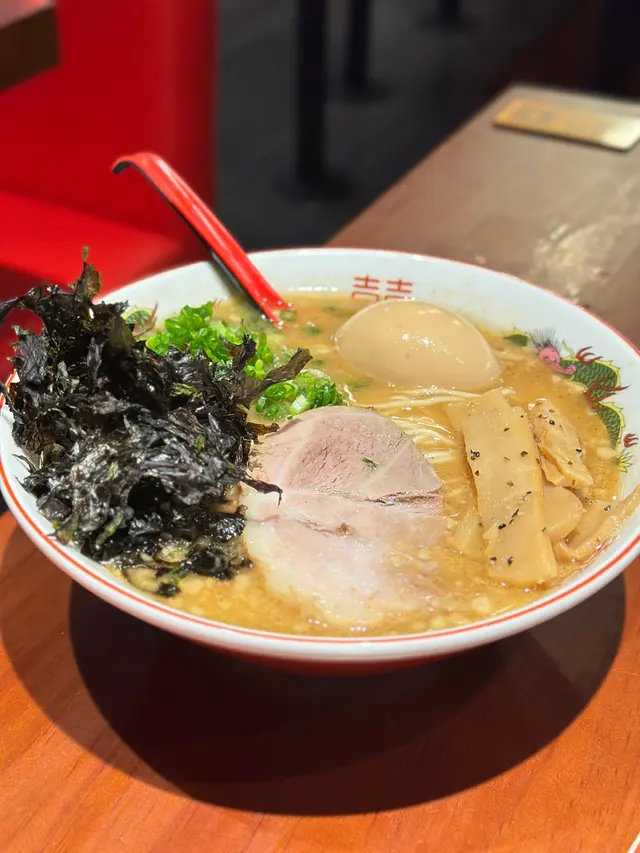 黑龍豚骨拉麵揀咗麵軟啲➕唔辣,有蔥、筍、紫菜及洋蔥🧅,加咗個玉子,個麵帶有濃厚嘅豬骨香氣,麵條吸滿咗湯汁,入口滑順,叉燒口感軟滑,同係日本食嘅差唔多