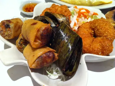 小型併盤內包含了香葉包雞炸蝦餅春卷。前者十分的油膩,幸好雞肉尚嫩;蝦餅相反地頗乾身,油淋淋程度沒雞肉那樣嚴重,咬落亦彈牙,不過在蝦鮮方面就失色了點;春卷炸得皮夠脆。餡內大部份都是素菜,是有點出乎意料之外的"清淡",吃起來也不錯....