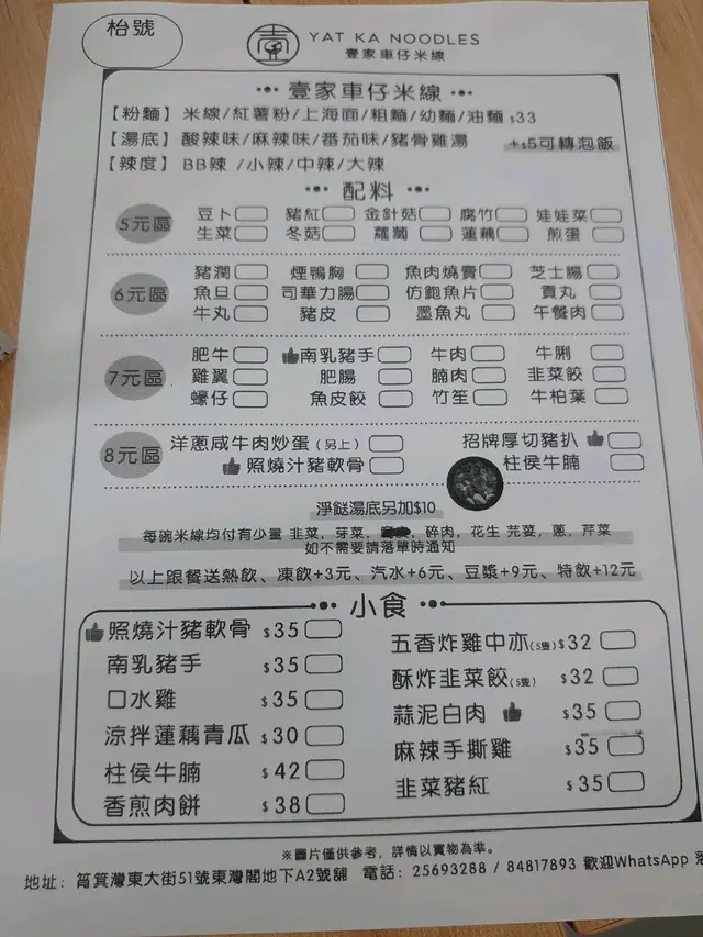 一間唔錯的車仔麵 IAMHEYO等级22024-08-28792 浏览 关注 粉麵有六款可以選擇 粗麵 油麵 上海麵 米線 紅薯粉湯底有四個 麻辣味/酸辣味/蕃茄味/豬骨雞湯個人喜歡蕃茄湯再自己加辣醬仲可以揀四個辣度餸方面 會揀雞翼(有炸過,抵食)咬落去夠脆中間有汁唔乾咸牛肉洋蔥炒蛋《一個餸有三樣嘢👍唔會炒到蛋好老, 咸牛肉再加埋半透明嘅洋蔥, 夠大份,非常滿足個人口味加多個娃娃菜野飲方面熱飲係附送 ,我叫左奶茶, 色澤均勻,夠滑, 茶葉冇苦澀 , 可以唔使落糖, 可以一試總數埋單連飲品都係53蚊,可以再去😋1洋蔥咸牛肉炒蛋$87以上食记乃用户个人意见 , 并不代表OpenRice之观点。赞好分享一間唔錯的車仔麵 壹家車仔米線 https://s.openrice.com/QrLT0EJXM00检举 张贴 评分5味道4环境5服务5卫生5抵食用餐途径堂食