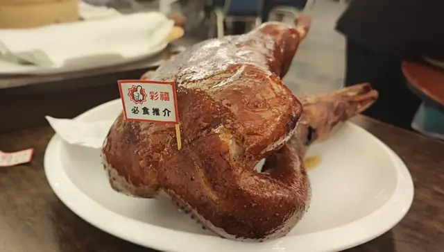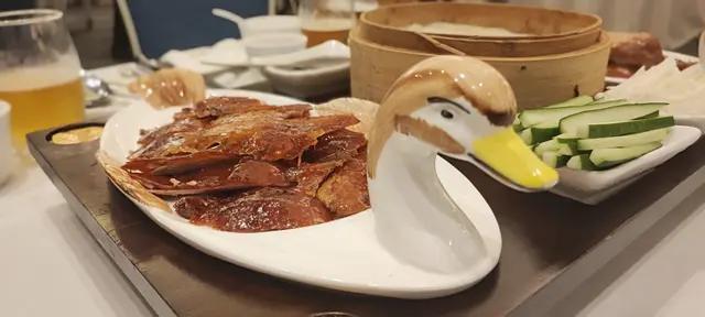 見菜單上的介紹的片皮鴨是得獎, 我們毫不猶豫地點了一隻, 店員把鴨原隻上端上, 鴨成為今晚的佳麗,我地都爭住拍照。鴨披上鮮紅色的盛裝, 表皮烤至色澤光亮, 夠大隻,賣相十分吸引, 看上去脆卜卜, 有種引人垂涎欲滴的感覺。片皮鴨最重要是吃皮, 咬下每一口都十分香甜脆口,充滿油脂,鴨肉鮮嫩多汁; 裹以面餅皮,青瓜及醬汁,能平衡鴨皮的油脂, 吃完都不會感覺一絲的膩感。