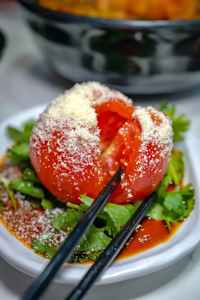 由經典嘅日式涼伴小食炮製成呢個香醋芝士鮮原茄,用原個去皮嘅番茄🍅,一開四後再加上芝士粉同撈埋三哥秘製紅油嘅香醋醬汁,番茄嘅甜、香醋嘅酸、芝士嘅濃,又幾fresh幾開胃