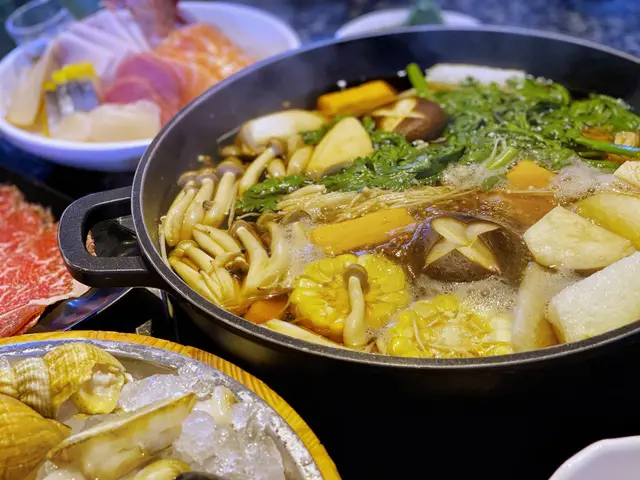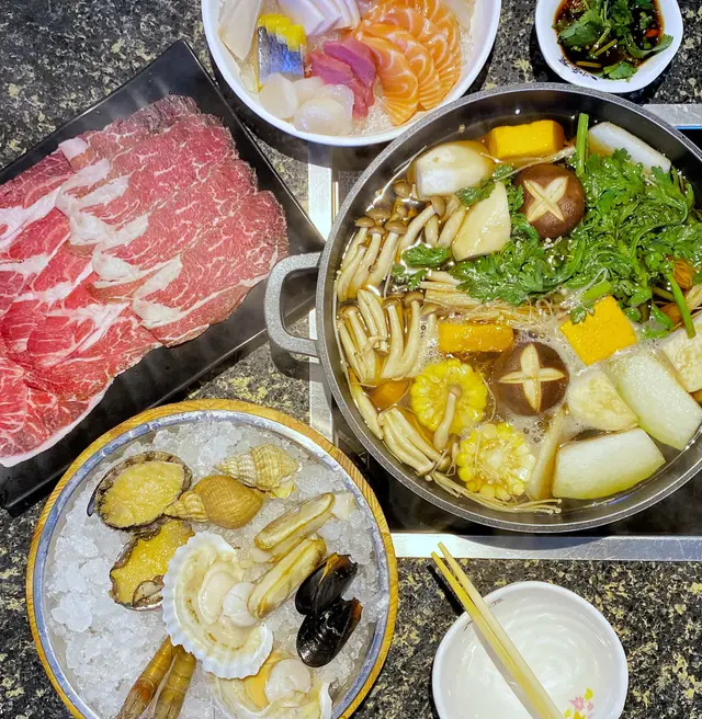 除咗M5和牛,店員仲送上海鮮拼盤,共有六款海鮮。兩位送上一人一隻鮑魚,煮四分鐘啱啱好,鮮甜彈牙,好厚肉!扇貝都係超級新鮮,肉質鮮甜。食完唔夠喉,仲有海蝦、廣島蠔、帆立貝、墨魚滑、象拔蚌、海蜆、蟶子、日本魷魚同東風螺,九款海鮮畀你仼點仼食,真係好易回本!