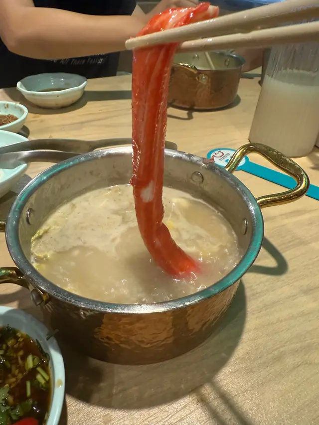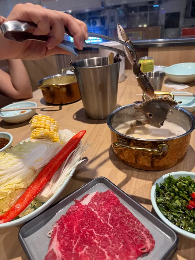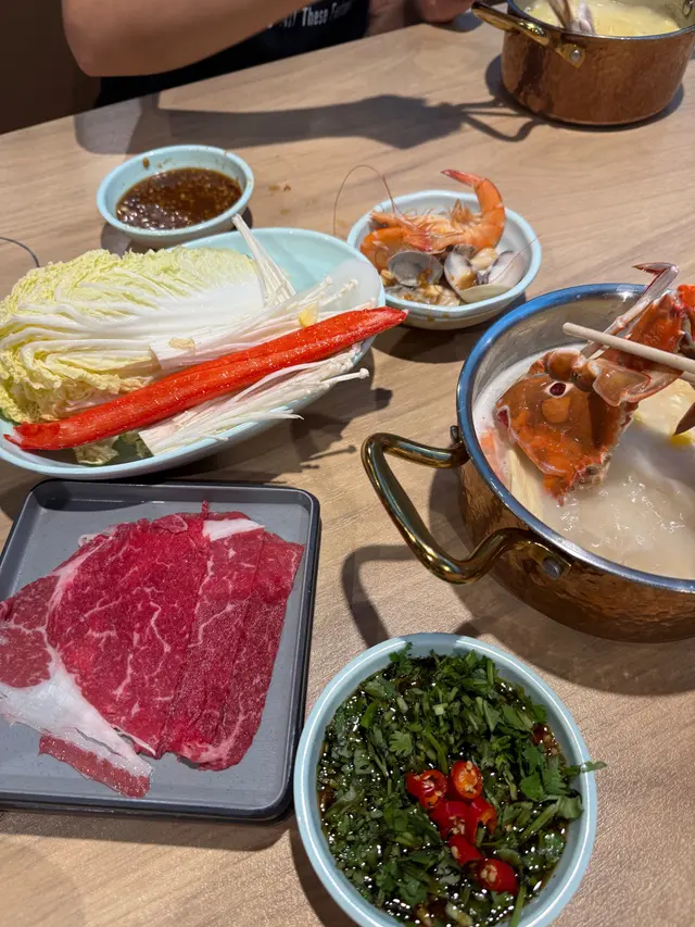 去到餐廳見到好多水缸,入邊嘅海鮮全部都好生猛,我哋仲可以坐窗口卡位,坐得特別舒服,我就急不及待點咗湯底就諗住去撈海鮮,原來呢度係一人一鍋,我覺得好貼心又衛生,食得零舍安心,另外呢度都有成8款特色湯底咁多:例如藥膳麻辣鍋、金湯花膠雞鍋,我哋就叫咗花膠雞鍋,見到湯底都好濃郁,不過重頭戲就梗係去撈海鮮啦,自己撈完自己食真係請勿特別好玩,除咗撈海鮮之外仲可以任食和牛,同埋唔同肉類、丸子、蔬菜,熟食炸物、酒水甜品全部都可以無限任食,仲要雪糕\飲品全部都係大牌子,連1664 生啤同埋Sapporo 都係啤酒任飲,真係太高興呀。