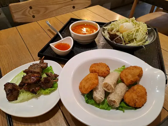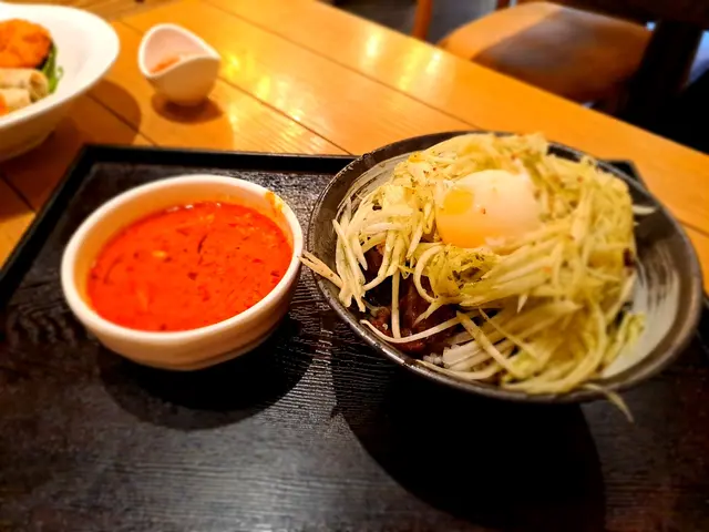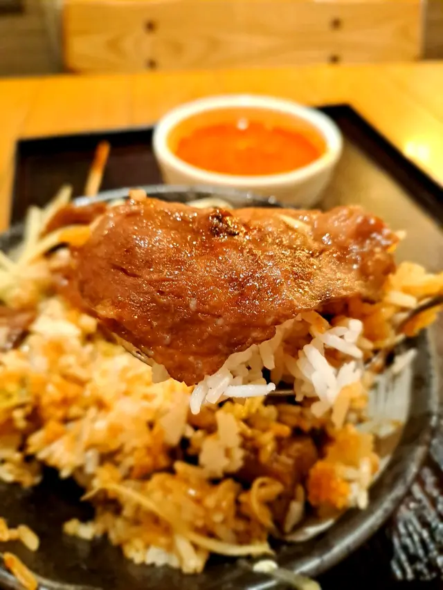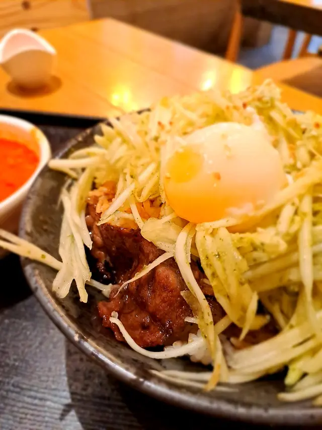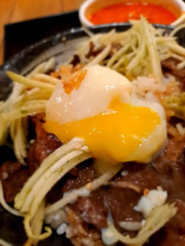 汁燒穀飼牛肉飯配青木瓜沙律加溫泉蛋。開頭以為木瓜沙律同溫泉蛋係二揀一,但原來係有齊哂兩樣嘢。