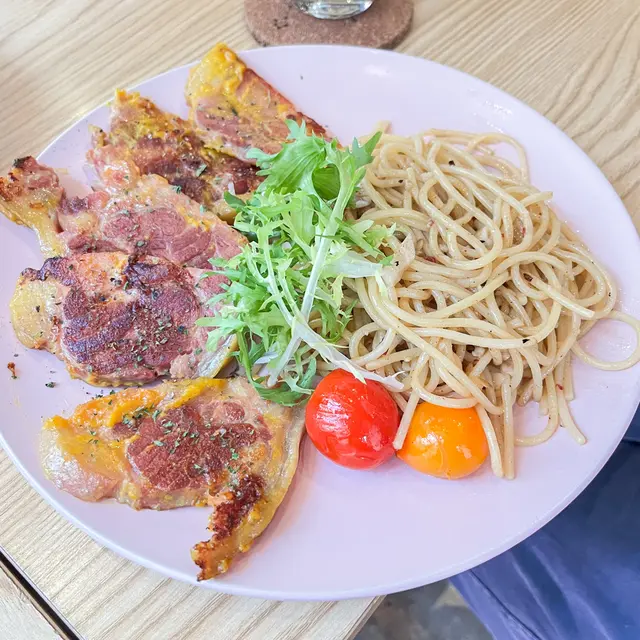 無骨豬手有4塊 微微用蜜糖芥末醬醃過 食落好惹味😋 豬手肉質嫩滑 唔會煎到好乾身👍🏻 意粉都有用芥末醬煮過 食落有微微辣味手、刺激應 幾特別🤪