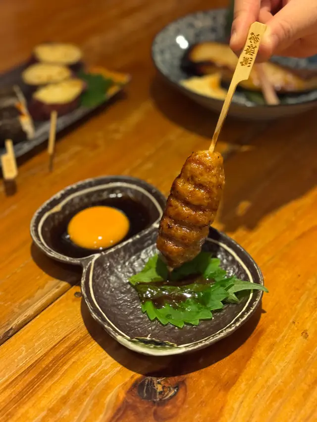 叫咗免治雞肉軟骨棒,側邊有生蛋黃汁加豉油,雞肉軟骨棒質地軟淋,加入軟骨增添口感,配搭生蛋黃醬更滋味