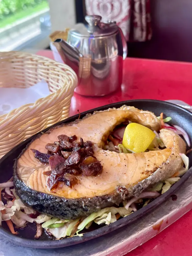 三文魚🐟外皮烤得焦香,用鐵板呈上,熱辣辣🔥,另外可加檸檬🍋汁提鮮🆙。