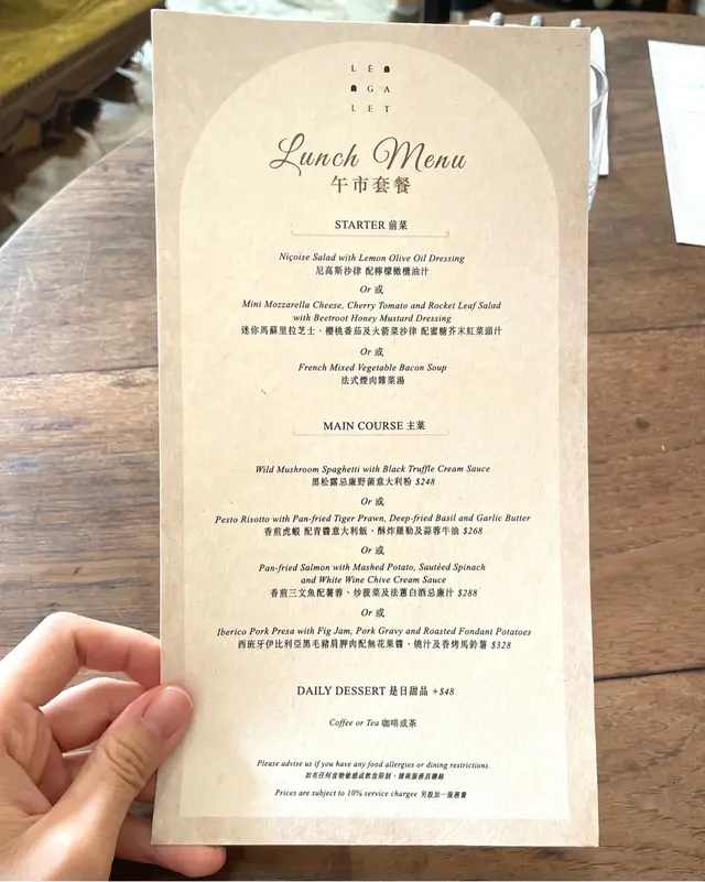 有lunch set,包前菜(三選一)、主菜(四選一)、咖啡或茶,另外可以加錢加是日甜品