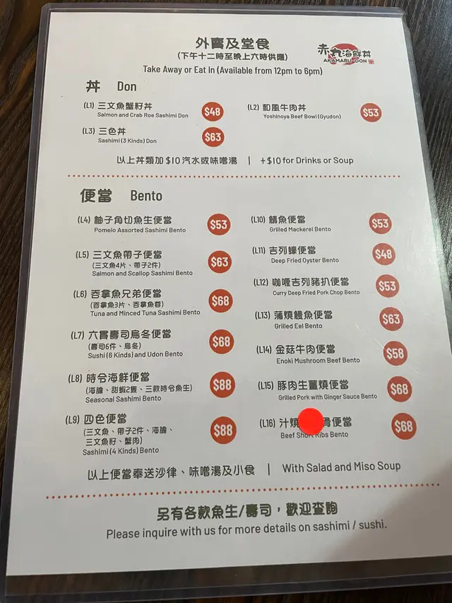 上環鰻魚便當 好味抵食 sirodlo_730等级42021-02-02378 views Follow 呢日同兩個戰友專登行去上環食飯lunch時間周圍都好多人見到呢間店唔使等位就二話不說入去試吓睇睇Menu 款式選擇唔多可以叫當或者便當 價錢都幾抵食佢另外仲有烏冬可以order我最後叫咗呢款 鰻魚便當🍱賣相都唔錯 有miso soup 中華沙律 🥗沙律飯都幾多 鰻魚厚身 蛋有點未熟曬 食落會滑身啲 但係個飯食到尾有啲硬整體黎講大碗抵食 只係$63 成set (唔包飲品)出菜快 整體感覺都幾好 有機會想試下sashimi or Sushi 😆The above review is the personal opinion of a user which does not represent OpenRice's point of view.LikeShare上環鰻魚便當 好味抵食 赤丸海鮮丼 https://s.openrice.com/QrLT0rkWx00Report Post Ratings4Taste3Decor3Service4Hygiene5ValueDate of Visit2021-02-02Dining Method堂食Spending Per Head$63